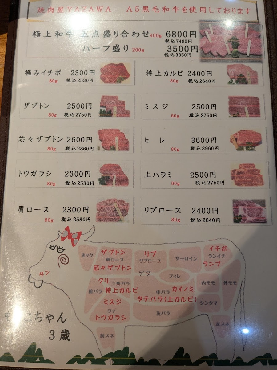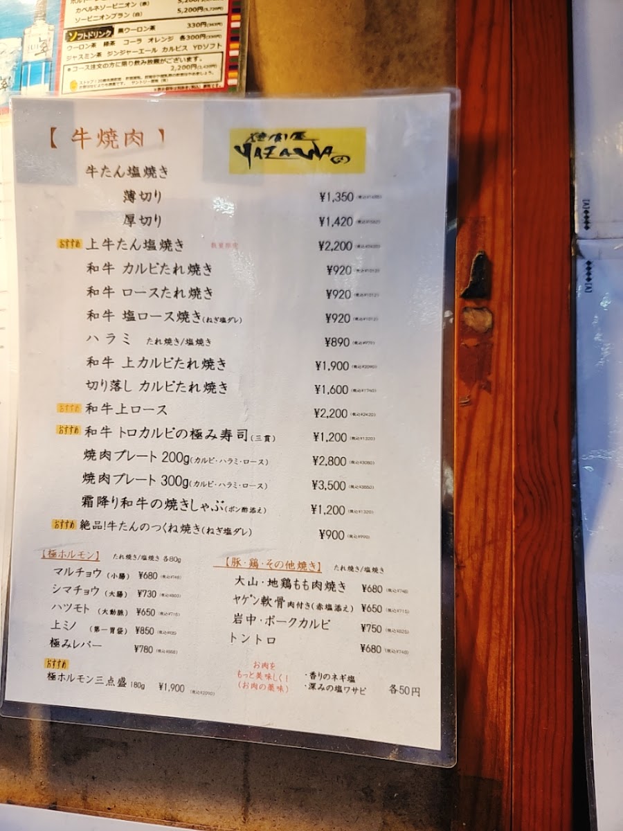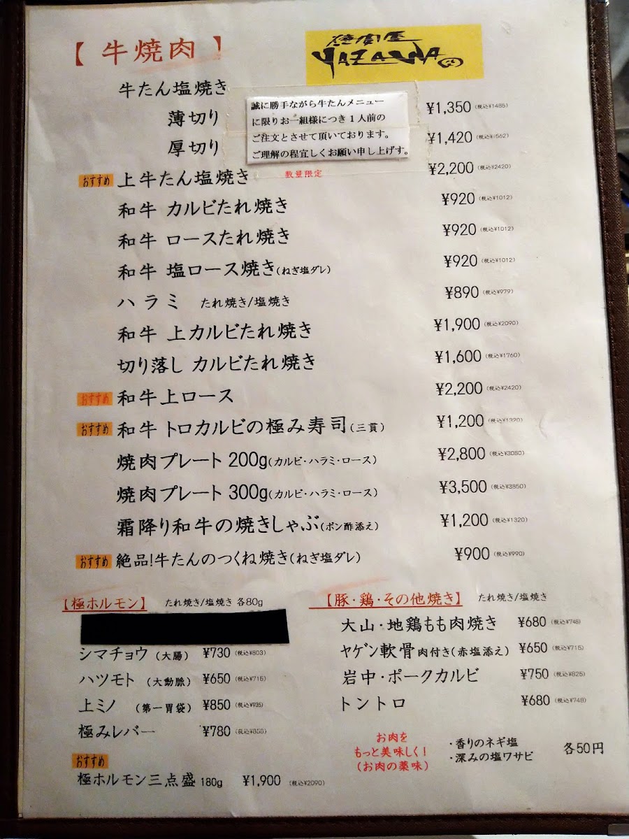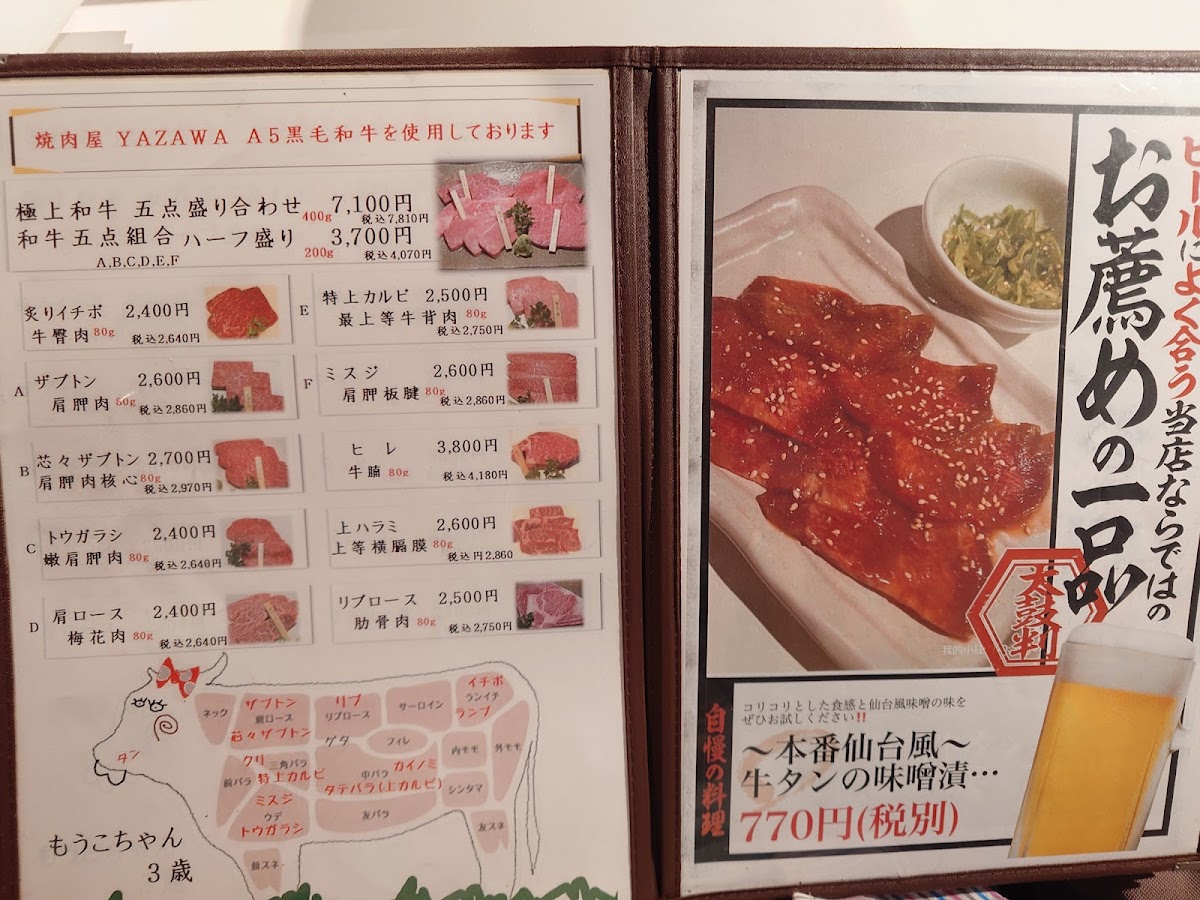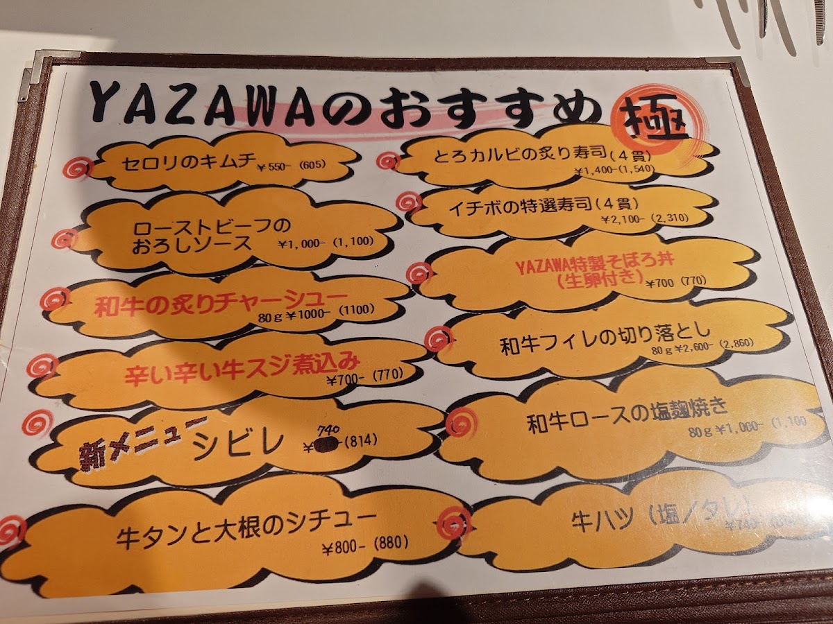 At Yazawa Tokyo, the menu is tightly focused and confidently executed, reflecting a clear respect for premium ingredients and balance. The pairing of タンとつくね immediately sets the tone, combining the clean, elastic bite of beef tongue with the juicy softness of tsukune, a contrast that highlights the kitchen’s control over texture and seasoning. This emphasis on High Quality Meat runs through the entire menu, where careful sourcing and precise grilling allow the natural flavor of the beef to stay front and center rather than being masked by heavy sauces. Alongside the meats, Grilled Vegetables provide an essential counterpoint, lightly charred to enhance sweetness and freshness without overpowering the main dishes. Staples like ネギご飯 add comforting depth, with fragrant rice and scallions acting as a neutral yet satisfying base that complements the richness of the grill. For something heartier, タン塩ハンバーグ stands out with its savory, tongue-forward profile, offering a creative twist on familiar flavors. The inclusion of 冷麺 1 2人前 brings a refreshing, cooling element to the meal, cleansing the palate after grilled dishes and rounding out the dining rhythm. The beverage selection, from ドリンク to the distinctive yazawaの芋焼酎, is clearly curated to match the food, offering both refreshment and depth. Taken together, the menu feels cohesive and intentional, showcasing a refined yakiniku experience that values quality, restraint, and harmony across every dish.
